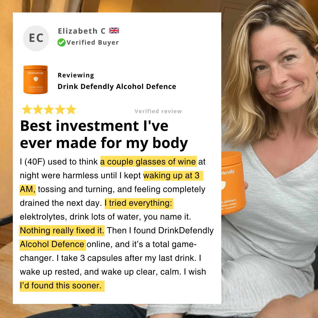 Try DrinkDefendly Alcohol Defence. If you don't sleep better after drinking, or feel at least 50% better the next day—we will give you a refund.