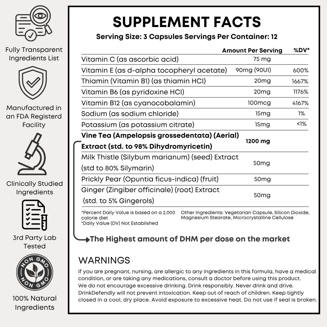 DHM is a natural flavonoid from Vine Tea that helps break down acetaldehyde — the toxic byproduct of alcohol — faster. It supports brain clarity, eases fatigue, and reduces hangover symptoms like anxiety, headaches and nausea.